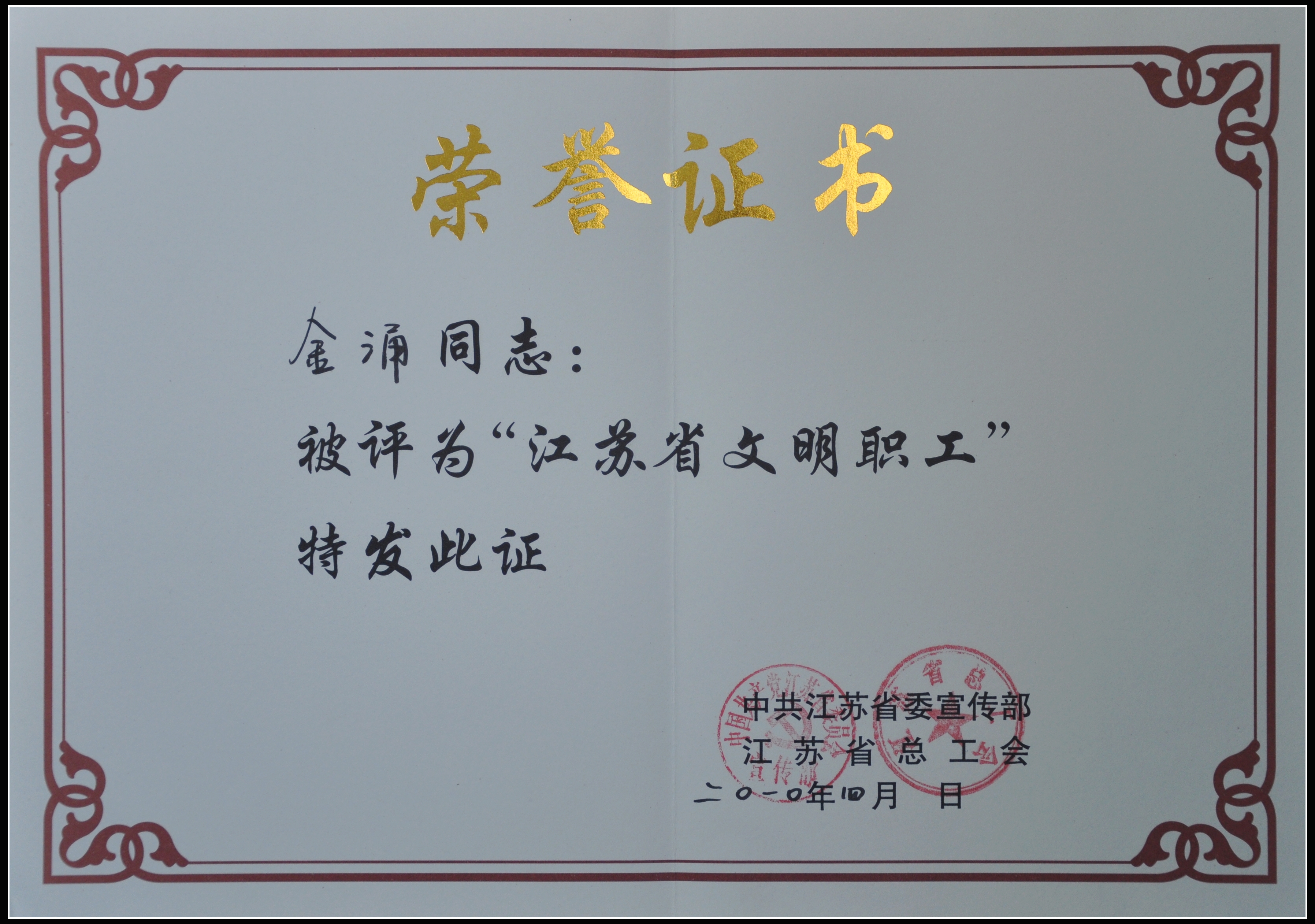 金涌榮獲“江蘇省文明職工”稱號(hào)