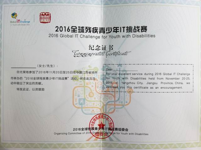 2016全球殘疾青少年IT挑戰(zhàn)賽經(jīng)過4天激烈角逐,于11月24日在揚(yáng)州圓滿落幕。此次比賽共有來自16個國家的104名選手參賽,相關(guān)的IT論壇及文化活動也同期舉行。揚(yáng)汽集團(tuán)憑借著過硬的資質(zhì)和良好的口碑,有幸為此次比賽和論壇活動提供了會務(wù)用車服務(wù)。