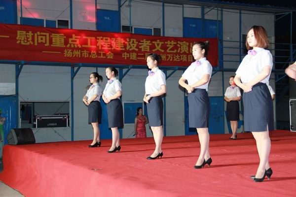 5月3日晚,由揚州市總工會主辦、揚州市建設產業(yè)工會承辦的“建設者之歌”——慰問重點工程建設者文藝演出,在揚州萬達廣場項目部生活區(qū)隆重舉行。我公司參演的《七彩揚汽——員工行為規(guī)范操》得到了在場領導和工程建設者的一致好評。市總工會副主席洪慧娟,市建設產業(yè)工會主任田繼榮,市交通產業(yè)集團黨委副書記、紀委書記、工會主席王寧生等領導出席了晚會。